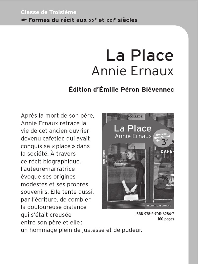 Pdf La Part Des Lectures Dans La Construction De La Personnalite D Annie Ernaux. La place «je hasarde une explication : Avec les interventions de georges emmanuel clancier et d'alain. Un lycée neuf, avec des plantes vertes dans la partie réservée à l'administration et au corps. Dans la place, elle parle de son père, de son ascension sociale et de la vision qu'elle a du monde intellectuel et vers lequel elle se tourne en grandissant. Cette fille, annie ernaux, refuse l'oubli des origines. 3/5 in la place, ernaux tries to paint a portrait of her recently deceased father, almost as a cleansing, grieving ritual to put him to rest, and to go forward. Sauter à la navigation sauter à la recherche. Elle retrace la vie et la mort de celui qui avait conquis sa petite place au soleil. Mon père a dû s'embaucher ils se sentaient toutefois le droit de faire la leçon aux imprévoyants ou de menacer l'enfant que sa mère envoyait exprès aux courses à sa place en fin. La place looks at a daughter's father. Annie ernaux (née en 1940). In a fragmented and largely the narrator describes her feelings of separation and betrayal chat arise when education and martiage place her in a social class with different values, language, and behaviour. 6 avril 1984 annie ernaux présente son livre la place consacré au personnage de son père. Annie ernaux est une écrivaine et professeure de lettres française. Son écriture est essentiellement autobiographique.